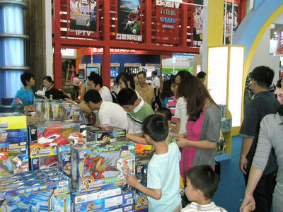 蓝猫动漫参加展会时,所生产的玩具受到许多小朋友的喜爱。