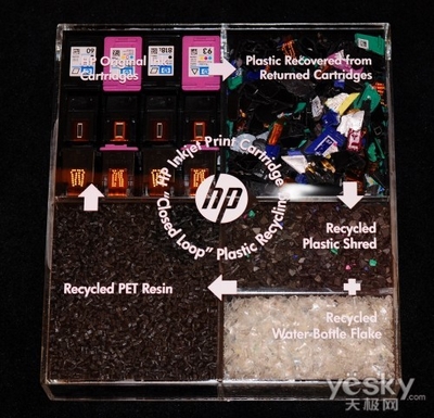 惠普推出业内首个“闭环”墨盒回收利用计划,在新的惠普原装墨盒生产过程中,可以使用惠普原装墨盒的回收材料和其它来源的 RPET塑料,如废弃塑料瓶等。自2005年以来,惠普通过“闭环”回收工艺,使用再生塑料共制造超过10亿只墨盒。